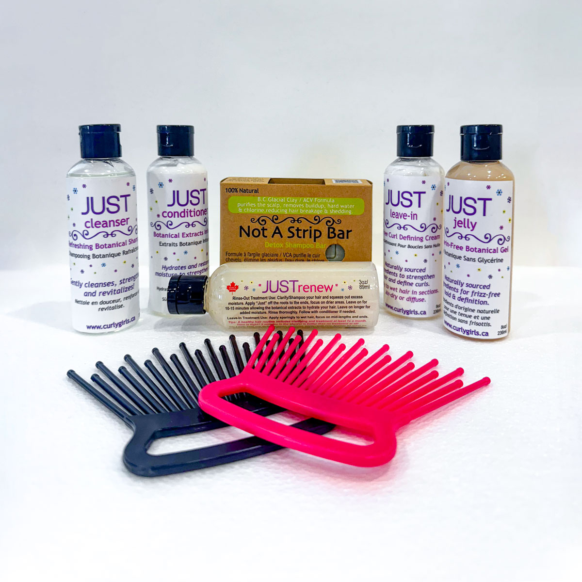 Revive your waves or curls with The Bounce Back Kit — your complete at-home curl reset. Transform your waves to curls at home! Includes 3 oz bottles of our Just essentials, a 2 × 50 g Not a Strip Bar clarifier, a curl pick, and a digital copy of The ABCs: How to Always Be Curly & Love It!